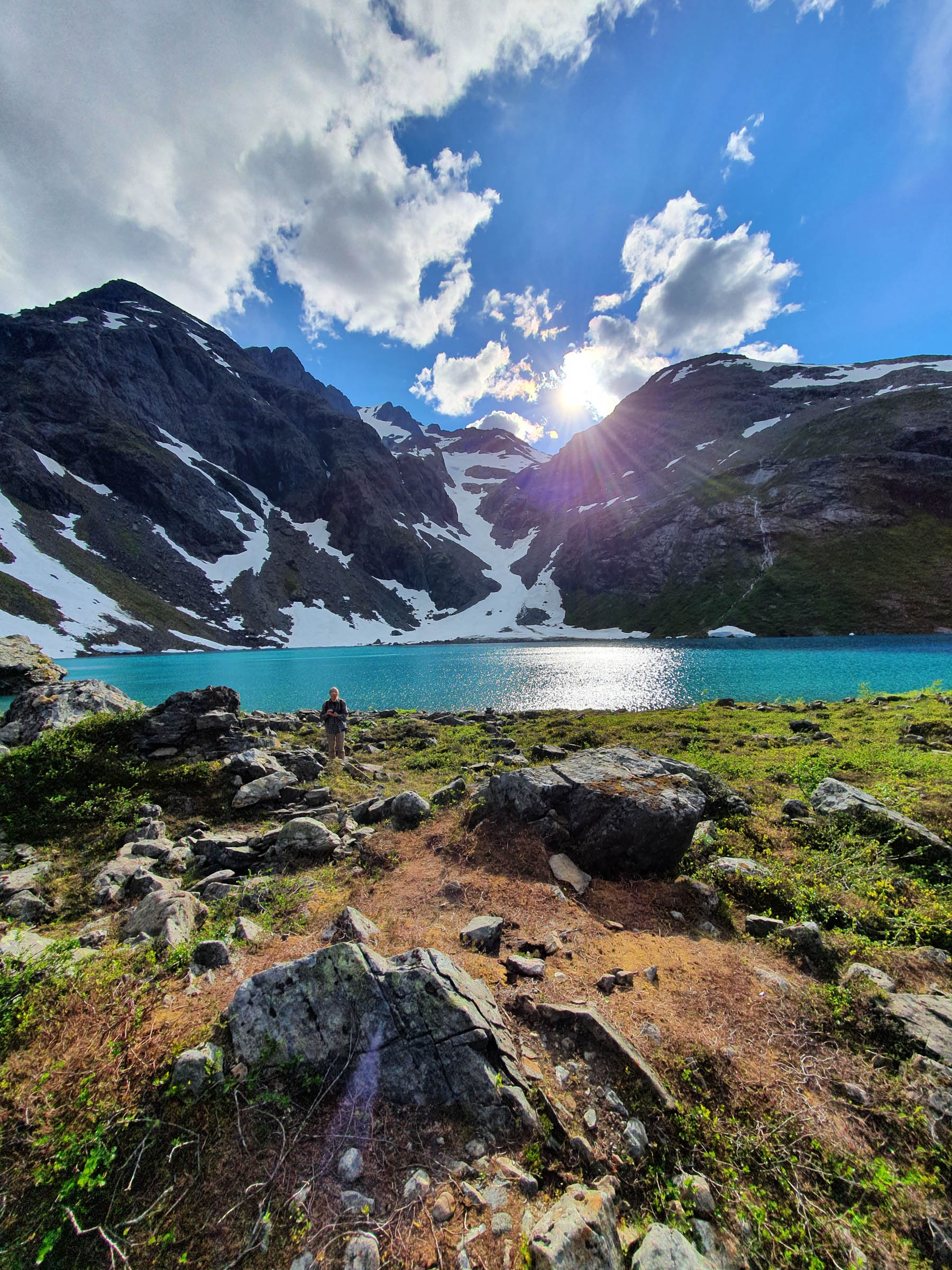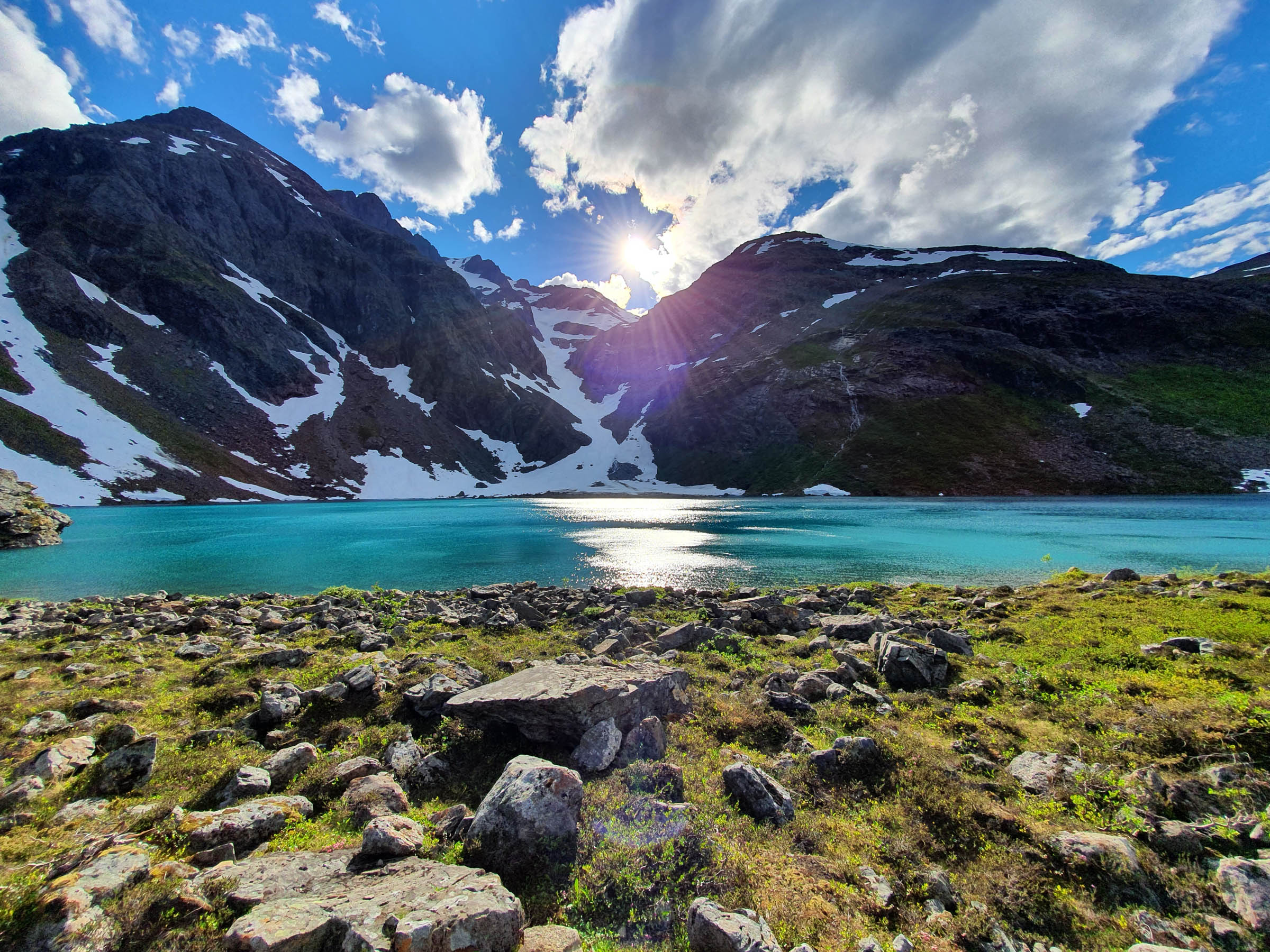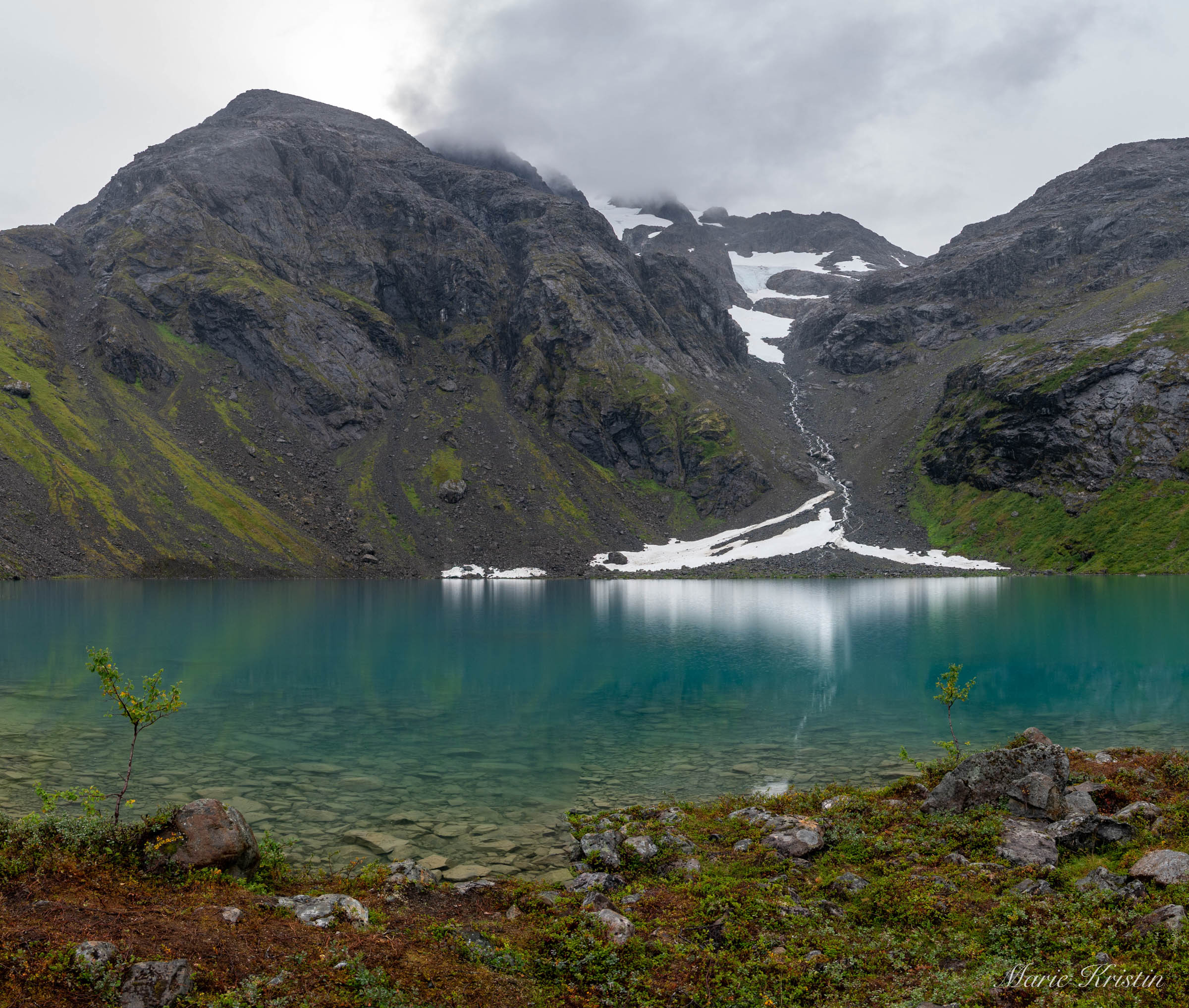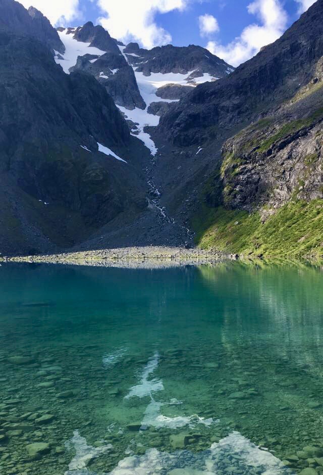 The atmosphere here changes with the weather, the season and the time of day. On a clear morning in June, the mountains reflect in water so turquoise it almost feels unreal, closer to the Caribbean than the Arctic, while lingering snow still reaches down towards the shoreline. On a damp September day, with mist hanging in the air, the lake turns darker and more mysterious — something closer to a northern myth than a summer postcard.