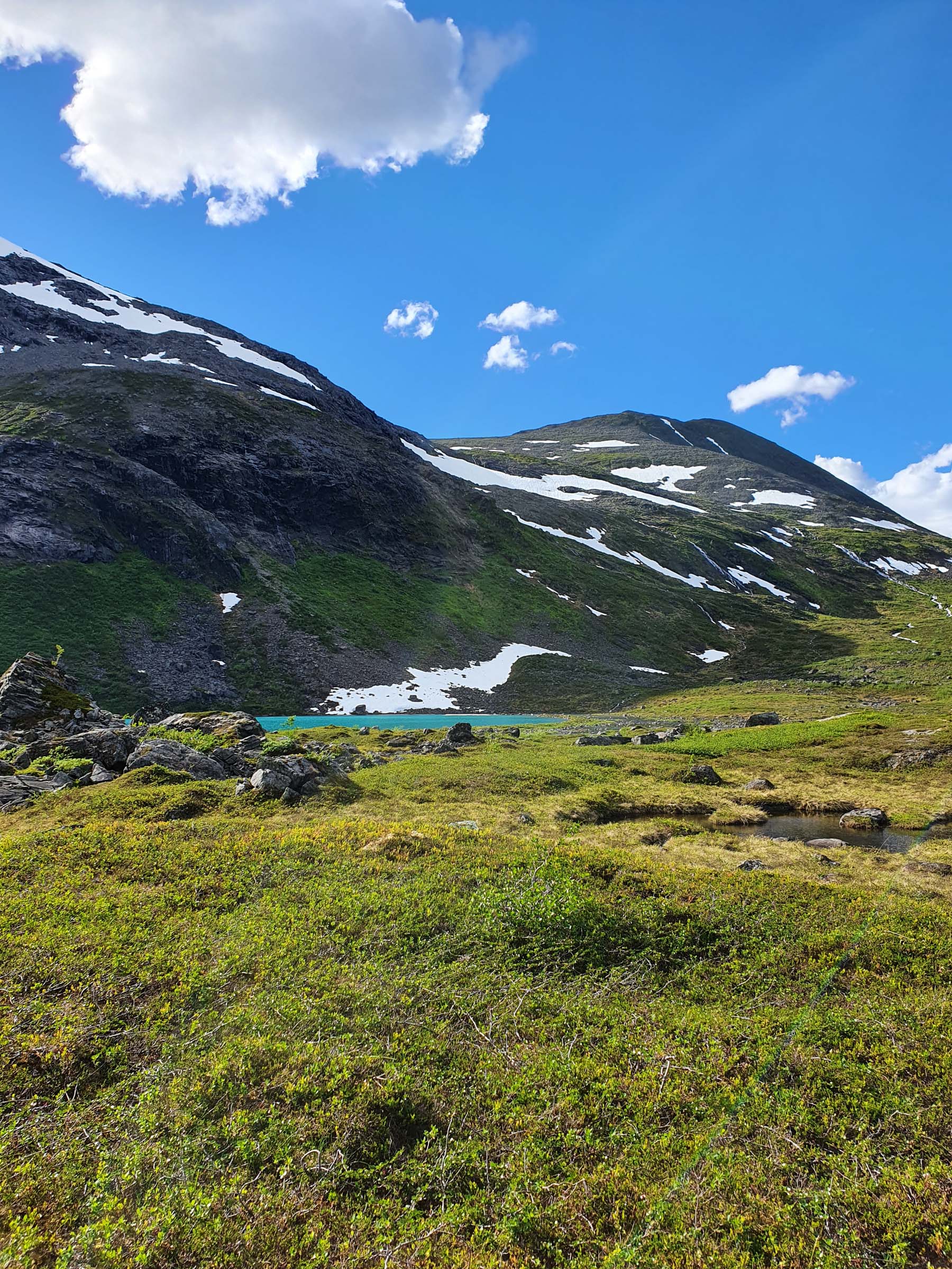 The highlight reveals itself only at the very end: a still mountain lake surrounded by pointed peaks, with the Kågtind glacier appearing between them. A rocky ravine carries pale glacial water down through the landscape before disappearing into a vast field of boulders. Moss and lichen soften the edges only slightly, and sound carries sharply between the stones. Yet it is the colour that surprises most — deep green, only partly transparent because of fine particles from the glacier, with large rocks visible on the lakebed below.